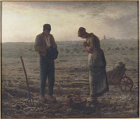 米勒的藝術創作,總是把焦點放在農民身上,風景成為背景襯底,他的作品,表現平凡人物純樸、平實的生活,把農民揮汗辛勞的工作,經過詮釋,昇華為高貴與聖潔。