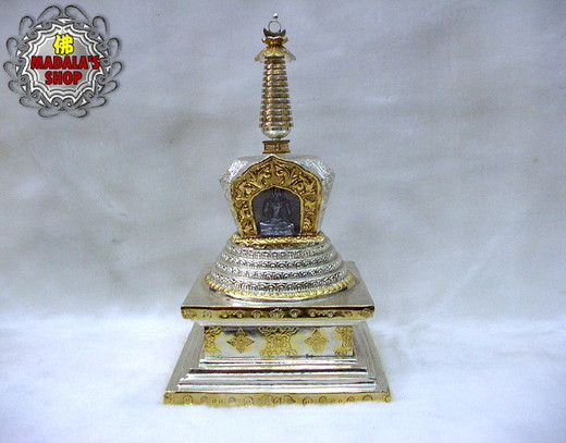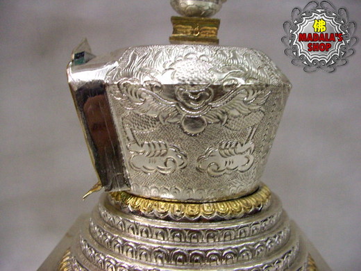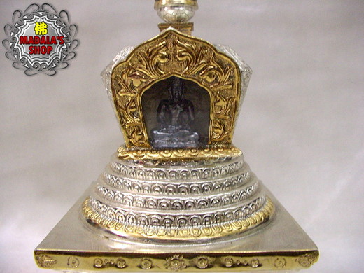 莊嚴緬甸手工精造藏式銀質鎏金佛塔,外形如照片所見,主要可分為三部分,下部為臺座,中間為佛竈,上方為塔尖,並有鏤雕花紋與鎏金莊嚴佛塔,塔中安奉銀質釋迦佛乙尊,釋迦佛後面空間可放一小玻璃瓶安置舍利或聖物。