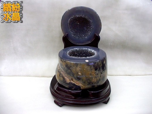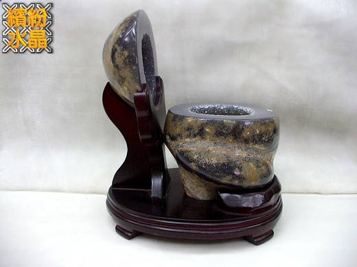 說明:此聚寶盆蠻特別的,外觀如照片所示,像極了一座馬桶造型,這麼特殊自然形成的形狀,過去沒有看過,以後可能也非常難得見到,不禁另人感嘆大自然的鬼斧神工真神奇。本座聚寶盆全部都是紫玉髓,洞內則是細晶粒,有一條帶狀類似泥的沉澱物,若您不喜歡可以倒一些水,再用軟毛牙刷輕輕刷除,不過個人建議保留,所謂土生金嘛。