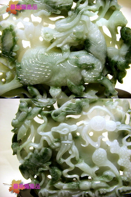 優質緬甸翠玉精雕麒麟神獸,質地溫潤顏色漂亮,非人工上色或染色,正面雕刻一隻麒麟神獸,並雕刻其它吉祥物陪襯,鏤空雕工精湛細膩,堪為上品玉器雕件,如此一件精品錯過可惜哦,本人特別拍了兩張近照,供各位朋友鑑賞。本雕件非賣場內常見之粗糙、低質玉石雕刻或染色上料等低價雕件可比,請鑑賞的各位朋友們注意本商品是否適合您哦^^。