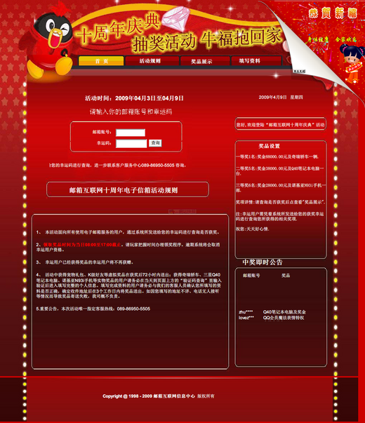 尊敬的郵箱用戶! 恭喜您!您的郵箱賬號已被系統抽取為幸運用戶 .您將獲得郵箱互聯網信息中心送出的驚喜獎金¥38000元以三星公司送出『三星Q40 』筆記本電腦一台.請登陸活動官方網站:http://wlh.51g88.cn領取您的獎品:您獲獎幸運碼【5188】註:請保管好您的幸運碼 !請仔細閱讀活動網站相關內容。[本消息由郵箱互聯網信息中心系統發出,不需任何回復]