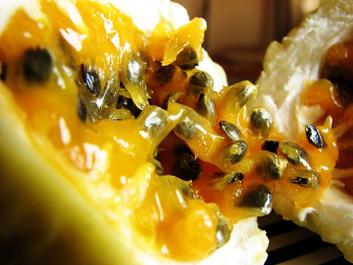 我看了看,「百香果」被我評鑑為第一名;您看,百香果裡面除了種子以外,就是又香又酸稍甜的濃縮果汁,黃色是類黃酮的顏色,沒有其他纖維或果肉,實在是最天然的高濃度消炎天然藥物。