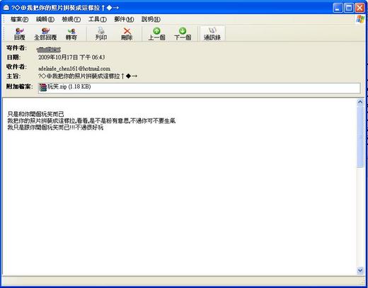 最近出現一則主旨為「我把你的照片拼裝成這樣啦」的信件,而主旨前後為加上幾個符號,並且附加一個ZIP壓縮檔,檔名為玩笑,壓縮檔內是一個LNK捷徑檔,