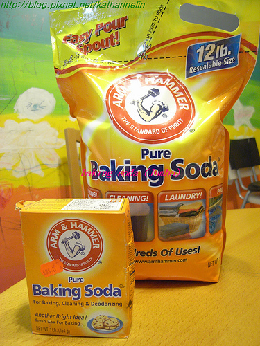 小蘇打粉一湯匙泡水,水變成微黃顏色,再把水果蔬菜放進去清洗。