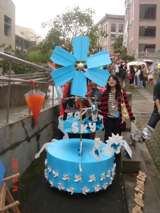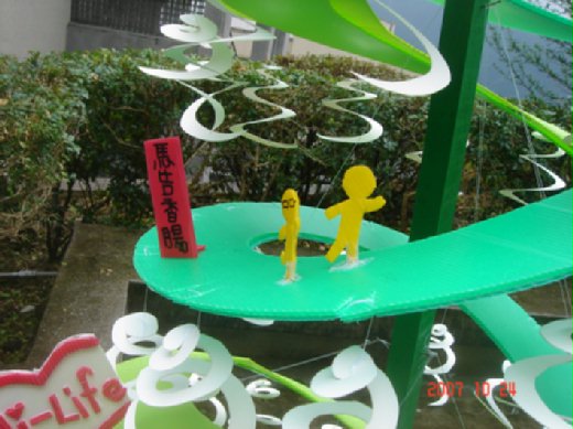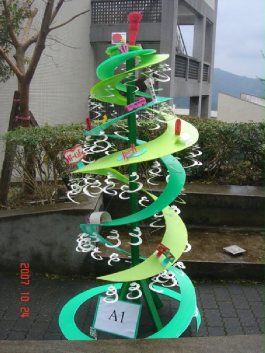 第二名的是綠色像是聖誕樹的風車,主結構位可以收藏的設計。由中心往上一拉,結構體便完成,很像是一路盤旋上山的路,上面有過山洞的公車,一路健行的葉老師還有便利商店的招牌,很搞笑。風車則是許多遇風旋轉的白色回旋體,具有巧思。