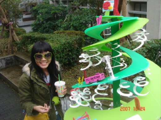 照片中帶著綠色眼鏡的學生,以誇張的造形與適當的搭配顏色還有流利的口語傳達,頗令人映像深刻,最重要的是傳達了其設計目標與理念。