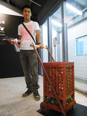 設計師金裕閔,就讀華梵大學工業設計研究所,曾自組設計工作室,這次以「花籬」參展,主要的創意來自環保意識抬頭,讓他突發奇想把花圃融入手推菜籃,比如說菜籃內的菜渣、種子等,都會經由菜籃的縫隙掉入花圃,成功融入自然界的循環裡。