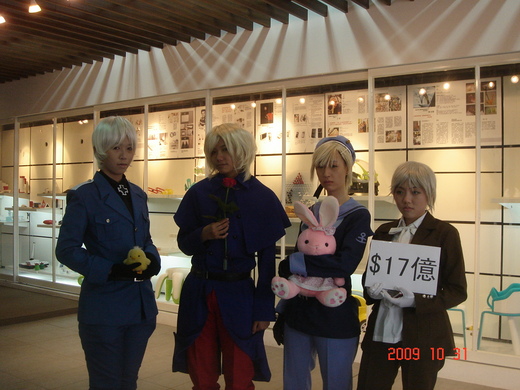 校慶學生 COSPLAY 意呆利,每年這時候,這些學生會進行角色扮演的活動,因為新鮮好玩吧,我請教他們是扮演何種角色,據他們說是漫畫意呆利。由右到左為冰島、挪威、法國與普魯士,連瞳孔都換了顏色呢!