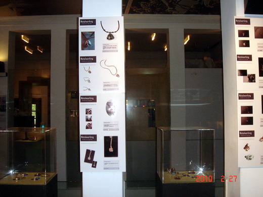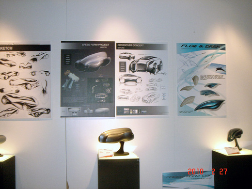 上樓梯進入二樓會場入口,首先飄進參觀眼中的映象是,大二交通工具組學生的速度造型設計與金工課程的金屬創作設計。主要展覽廳中有大二學生的壓克力設計作品,學生將其設計概念以壓克力材質製作模型呈現,另外還有大三學生以星際大戰故事進行武器設計,以4週時間完成草模製作,並運用寒假4周時間完成最終精模,很多作品以LED燈進行科技的意象裝飾。最後,還有以鋁金屬薄片所形成的立體創作。