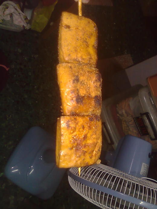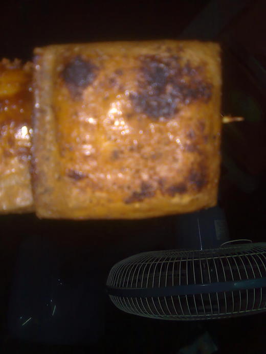 (聽我姐夫說豆干先炸過,然後再烤再加醬料和辣粉~現在回想還會流口水