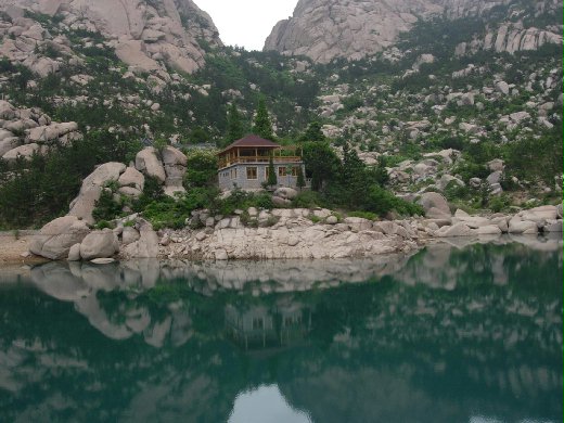 谷中有一曉望水庫,水質清澈,潭中石頭清晰可見,色澤猶似藍寶石般透亮而有質感。延著水庫前行,不多久看見一茶館,名曰” 龍澤閣”,坐北朝南,木石結構,典雅而溫馨,在此小憇片刻,喝上一盅嶗山綠茶,欣賞著鳥語花香,古藤綠樹,倘佯於幽靜空曠山谷中,不覺有古樸幻妙之感。