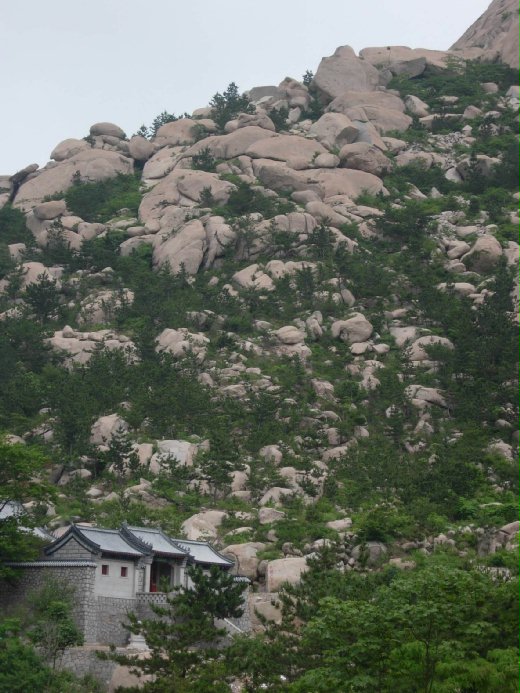 過了道觀,漫步在石板小徑上,草遮花蓋,苔痕縷縷,面對青山,松翠柏綠,鳥鳴猿啼,行走於其間,不禁使我想起杜甫”映階碧草自春色,隔葉黃鸝空好音。”的詩句,令人為之慨然,另一邊則可遠眺黃海與天連色,一望無際,觀賞此般雲蒸霞蔚的壯麗景色,頓覺心胸開闊,神爽氣舒。