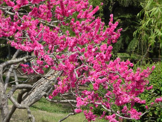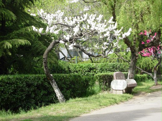 五月正值一年一度的櫻花盛會,那一大片燦爛耀眼的櫻花,有的艷如朝霞、有的白似瑞雪、株株爭奇鬥艷,頗有雲蒸霞蔚之態。它似乎在人們不經意中突然艷麗起來,容光煥發、嫵媚動人,而當你注意到它的時候,卻又比雪花還柔軟,比飛絮更鬆緩,彷彿整個人輕盈地漂浮在櫻花的海洋裡。走著走著,經過桂花路,轉進海棠步道,出了牡丹園後,還有水蜜桃、雪松、桃花以及從荷蘭移植過來的鬱金香,無論是紅的、粉的、黃的、紫的、或黑的,競相開放,顯得豔麗而溫馨,讓過往的旅客們嘆為觀止盡興而歸。
