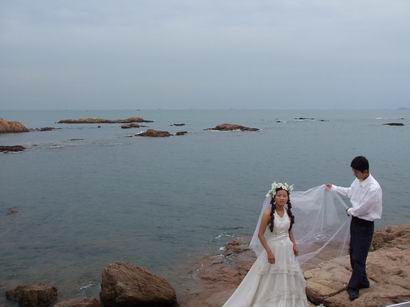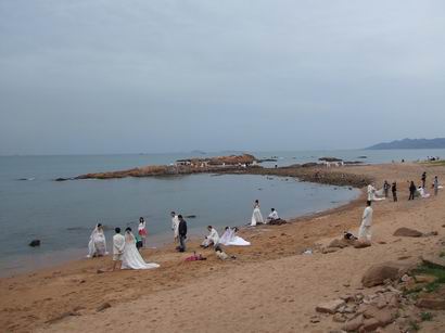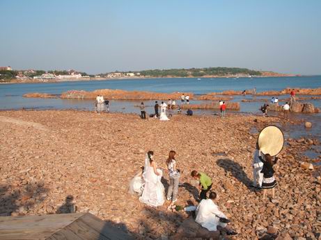 從第三海水浴場沿著濱海棧道,可到花石樓及第二海水浴場,這是我很喜歡帶初到青島的朋友走的一條路。沿途海岸線美,自不在話下。幾間大的露天海鮮餐廳,更是我們夏日消暑時的好去處。但我特別想介紹的是這條路上的奇觀─海邊的新娘們。 好多的新娘子!這是三月寒風冷颼颼時,裹著大衣仍不停抖擻的我,訝異的看著在花石樓附近海邊,許多穿著白薄紗拍照的新娘,發出的贊歎!從小喜歡看新娘的我,這下看的可真夠。拍照的新人,比到此遊玩的遊客還多。 真正的新人,大都是在假日時才會出現,可能都是利用宴客前、後的空擋跑來拍照,所以穿戴就有喜氣洋洋的華麗感覺。平常時候,海邊出現的新娘們,是三五成群的,輪流讓婚紗公司的攝影師以制式的動作擺佈著。這邊一堆新娘、那邊一堆新娘,仔細一看都是穿著簡陋的白紗、戴著塑膠花似的飾品,有時還可看到裙下穿的牛仔褲。再談談那個拍照的配角─新郎們,大都是以一套白西服出現,乍看之下,我不禁要聯想到台灣那個吹奏的樂師(知道我說的是那種樂師嗎?)。其實也不能怪新人們!服裝倒底是婚紗公司提供的。也不能怪婚紗公司!就成本考量,也不能提供好的婚紗在海邊水裡來、水裡去的糟蹋。只要能拍出美美的婚紗照,讓參加喜宴的來賓欣賞贊歎,這過程誰會在意呢?新人也還有一次可以真正華麗登場的時候,拍照時的衣服也就不需太在意了。
