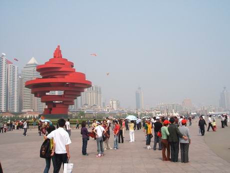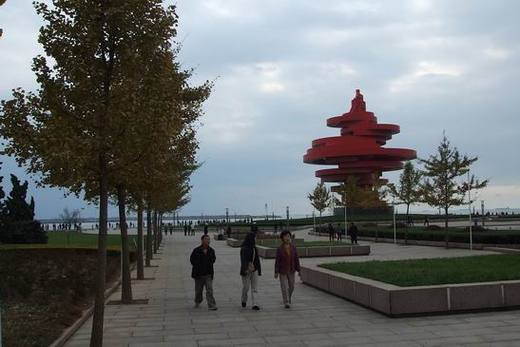 五四廣場顧名思義就是為紀念「五四運動」而命名,火紅耀眼、巍峨的巨型雕塑「五月的風」也源義於此。相信很多人和我一樣對「五四運動」這個近史,並沒太多的了解,只會記得曾在書本上讀過。但「五四廣場」對於青島人及我而言,卻是一個好去處。 我喜歡在午後,或是散步、或是坐車的特意先到旁邊的「鹿港小鎮」,喝杯咖啡看看台灣的報紙。之後,就是順著前面的小徑走到海邊。「五月的風」就在這條路的前頭,有時我也會站在那裡看人放風箏。從市區看五四廣場,海就在前面不遠之處;從海邊望向五四廣場,高樓接踵排列在眼前。觀光客也許只是為了留下「到此一遊」的印記,在「五月的風」之前拍照留念也就算了。但我這異鄉客在這廣場的海邊,卻似乎看到了故鄉的海。