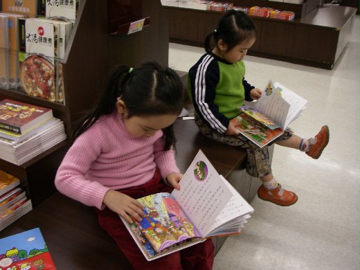 每次到大賣場,姊妹倆一定會衝到書櫃前自個兒挑書來看。雖是有模有樣端坐著,但其實只是瀏覽「圖畫」罷了!