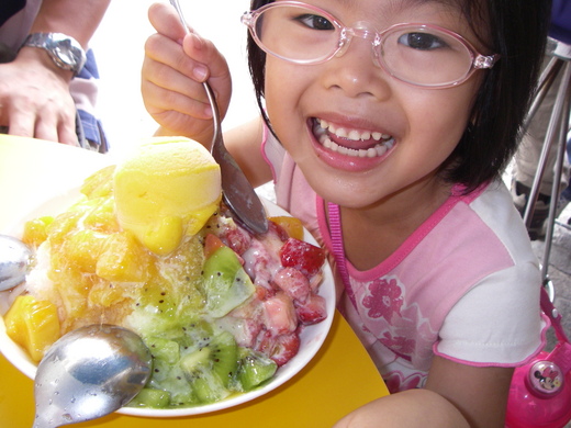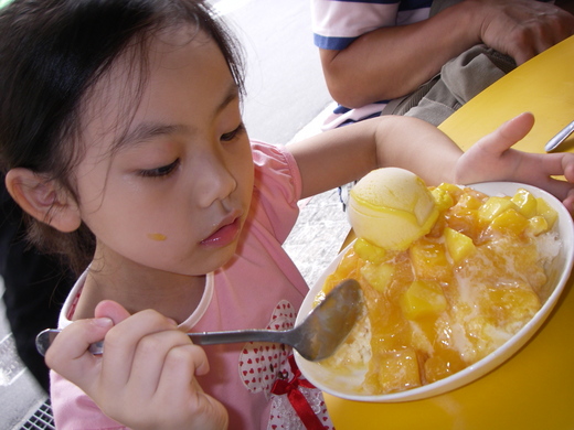 小姐妹們在植物園裡看松鼠亂竄一通後也漸漸失去耐心,炙陽下,唯一能安撫曬到虛脫的姐妹倆的只有冰啦!因此,火速趕到永康街,直奔芒果冰店。