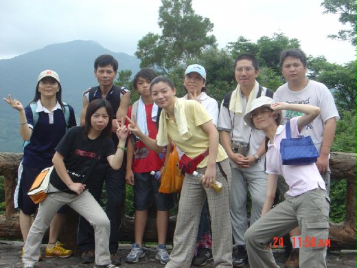 記得二年前爬完全程需要三個小時的時間,昌哥的小女兒下山時還是由昌哥背著下山的,今天竟然一口氣走完全程,且這次花不到二個半小時的時間。因為今天帶了相機,下了山在東眼山的遊客中心前靠欄杆的位置幫大家拍了團體照,拍得正開心呢,小藝就說換她幫我和同學們合照,當要往欄杆位置接近時,頓了三秒,看清楚地方的東西之後,尖叫了很大聲,來不及拉了所有人,只能接著最接近我的同學往回跑,大家都被我的舉動嚇到了,也都個個驚慌失措的一 邊離開欄杆處,一邊回頭看到底我看到什麼東西了,我向來天不怕地不怕,但最害怕也最覺得恐怖的東西就是蛇了,簡直是要我的命,我的臉色已嚇到慘白了,小鄧說那是條南蛇不會有毒的,不必害怕。後來那隻蛇也慢慢的悠閒的離開了,小鄧說是被我嚇跑的啦,他還說,原本要假裝有蛇要嚇我的,因為我也曾經被他嚇過一次,嚇到整個人跳得好高也慘叫了一聲,他老兄看了真開心呢,但現在可以不再嚇我了,因為被嚇到了,也忘了要和同學補拍團照了。