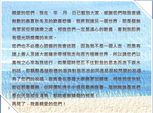 前一陣子在聯合報看到有篇舉辦生前告別儀式的活動,突然想到自己在幾年前也曾寫過一篇暫別文,為何叫暫別文?因為只是暫時的離開而非永不再見。我還設計了訃聞的封面及內容。此生能在活著的時候向認識與不認識的所有有緣人做一次真心的告別,還真是件不容易的事。