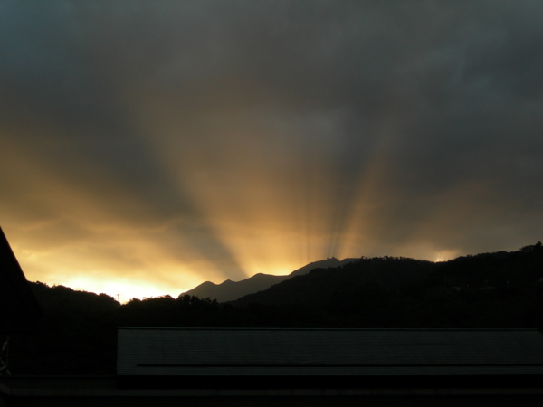 回程在大殿等車時,突然在天際中看到太陽如佛光般在雲層與山巒間射出一道道的光茫,讓我感到如妙法蓮華經卷第七 妙音菩薩品第二十四中的經文「爾時釋迦牟尼佛放大人相肉髻光明,及放眉間白毫相光,遍照東方百八萬億那由他恆河沙等諸佛世界..........,為無量無邊菩薩大眾恭敬圍繞而為說法,釋迦牟尼佛白毫光明遍照其國」。這道光真的攝住了我,很震撼,釋迦牟尼似乎也是再次提醒再次叮嚀著我受完戒才是修菩薩道、行菩薩行的開始。