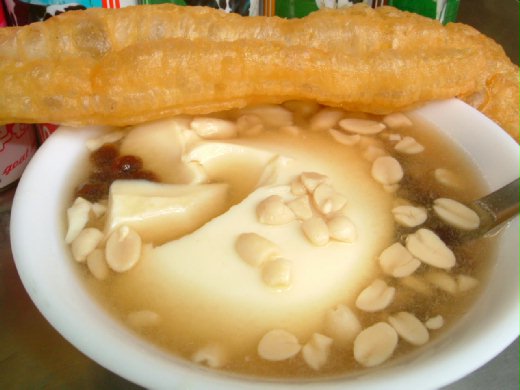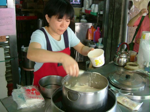 裝豆花的桶子是燉在熱水裡保溫著,旁邊有一鍋又香又濃的紅糖水,小販用一隻薄鏟子將幾片嫩白的豆花斜斜地杓起,放進碗裡淋上糖水,再澆上熬好的薑汁,豆花就浮在糖液裡,呈現迷人的清純和誘人的香氣。