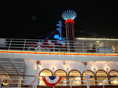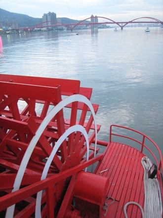 入夜後亮著一身光彩的「皇后號」駛離碼頭,就成為是淡水河上的明星了!尤其是船尾那個大紅色的明輪槳攪起淺淺的水花,真是太美了!