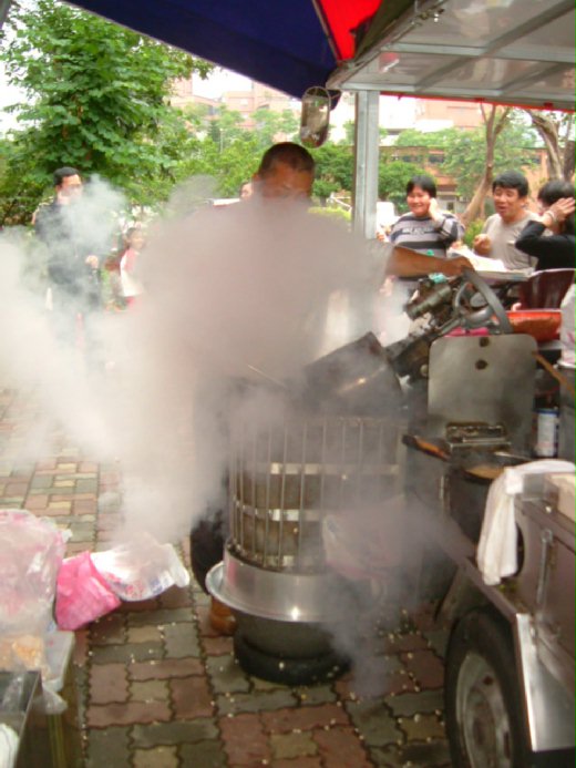 且看他不急不徐地把黑呼呼的鐵鍋移開爐火,然後用根鐵棍開啟鍋蓋。
