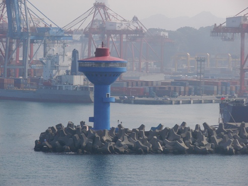 港口的燈塔立在消波塊上面,像是對遊子的召喚,這座藍色的燈塔就是「光華塔」。
