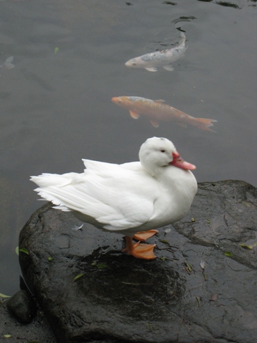 春雨中嬉戲的綠頭鴨真的很幸福,水中游泳的錦鯉也很快活,「三富花園農場」裡一雙雙、一對對的禽鳥游魚,模樣羨煞人也‥‥