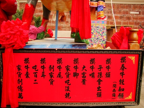 「摸春牛」這個民俗活動全台各處都有,摸不同的部位,有不同的意涵,台語俗諺的記載立在一旁,讓「摸春牛」的人邊讀邊摸,實在很有趣。