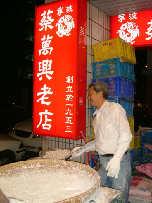 因為「蔡萬興」老店距離台北燈會的展場「中正紀念堂」不遠,於是二人興致勃勃趕了過去,還沒過街呢!老遠就看見一條長長的人龍排在門口,是店家在騎樓下當眾「滾元宵」啦!