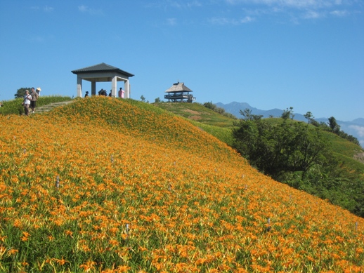 盛開的「金針花」有人叫她「一日美人花」,因為她早起開花暗暝謝,所以賞花的人要趁早上山。