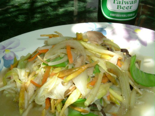 這一帶的小吃店裡都有大火快炒的青菜,「高麗菜」又脆又甜,「地瓜葉」鮮嫩可口,「山茼蒿」「山芹菜」「山蘇」「山藥」‥‥各有不同的滋味,既便宜又好吃,尤其「草山箭竹筍」更是特產。因為早年禁採所以價錢貴,近年來量多了,對饕客而言是項福音。