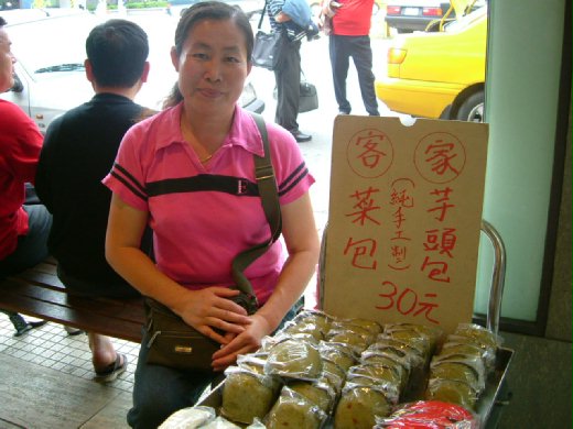 她守著一個小推車,自製自銷草仔粿,紅龜粿,標明是「純手工製」。