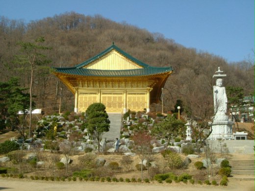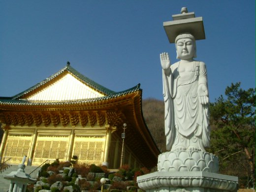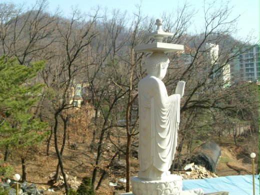 在「三角山守國寺」的院落間立著一尊雪白的佛陀塑像,造型很特別。