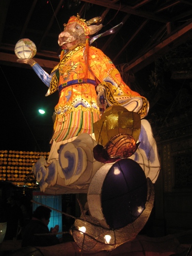 2009年歲次己丑,肖牛,所以用「牛」來造型的花燈非常多,在龍山寺「平安總燈」的旁邊就是今年當道的「牛王主燈」,這頭牛王身穿金黃色的龍袍,十分華麗,牛頭加冠,一手執寶劍,一手擎光明珠,細細看這顆「光明珠」原來上面畫著三大洋五大洲的地圖,真是有趣!