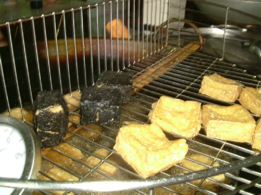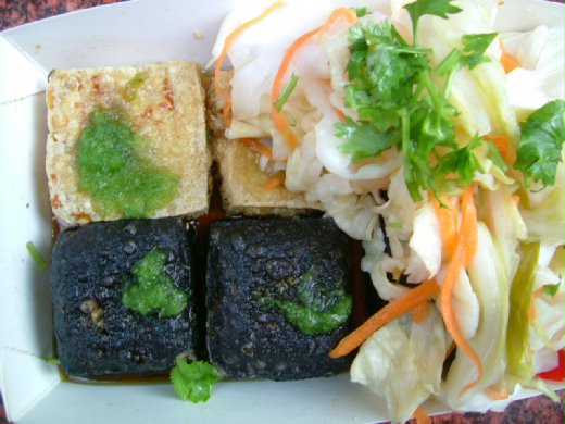 墨黑的豆腐放在高溫的油鍋裡炸透,外皮焦脆,異香撲鼻,一口咬下去卻發現黑皮豆腐的心子仍是白色的,有點「面惡心善」的意味在口中流竄,非常有趣。