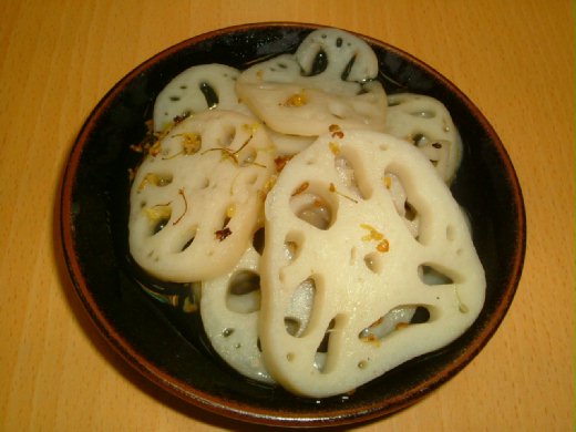 首先是「清醋藕片」,把新嫩蓮藕刷洗乾淨,橫刀切成薄片,入滾水燙熟,再用白醋、冰糖醃漬入味,即成消暑妙品。
