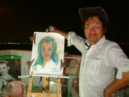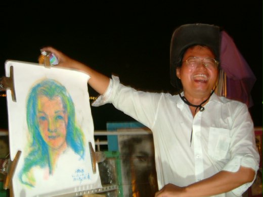 一會兒,四周就圍上來許多過客,有的人盯著我看,有的人盯著他的畫看‥‥‥‥使我有點害羞的感覺。