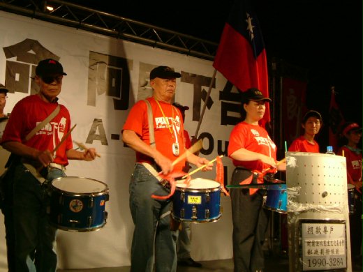 中正紀念堂的「大中至正門」那頭傳來一陣陣擊鼓聲和「阿扁下台!阿扁下台」的人聲。台上一個和尚模樣的人身著黃色的袍子奮力做出倒扁的手勢,台下全是「紅衣人」大家熱烈呼應:「阿扁下台 明天再來!」。