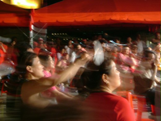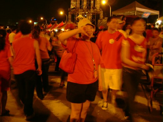 今晚人潮滾滾的氣氛很像逛夜市,頭髮斑白的「老哥胖妹」打扮起來的火爆勁可不輸給「帥哥辣妹」的搶眼「倒扁裝」,就連家裡的狗狗都穿上大紅的背心幫忙倒扁。
