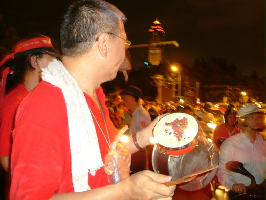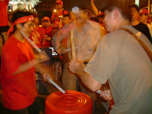場子中間有一位標緻的女郎和一個中年男子隨著鼓聲及眾人的歡呼聲把頭搖成波浪,身子擺成起乩的律動‥‥明快的節奏會蠱惑人心,不久就有人接下擀麵棍,繼續不斷地擊鼓,細看這群如痴如醉的鼓手,敲的是竟一個大水桶和二個空保特瓶呀!這也是「創意」。