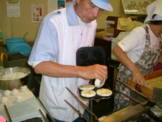 大約講起來,「梅枝餅」是把紅豆鹽梅的餡子用米糰裏住,再用火烤成兩面微焦的圓型餡餅,餅上面有一朵烙印的五瓣梅花。