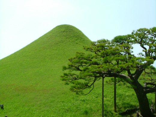 這兒的假山假水是仿富士山景而建的,小巧的富士山,起伏在綠色的草坡間,旁邊點綴著幾株長年新綠的「五葉松」,能堆出人們心目中的神聖感。