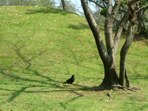 斑駁的櫻花樹下,雖然還舖著油綠的草地,但草坡上已散了一些剛剛落下來枯葉,秋風裡老烏鴉孤單的身影,和一個遠遊的女子,在這個時空中交會的目光,令人心動不已。