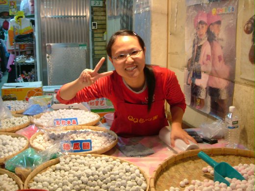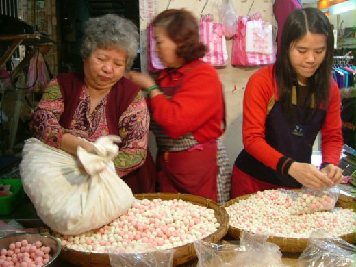 因為這一天會擺出許多「搓圓仔」的攤位,巧手利落的「歐巴桑」在現場用溼揉的糯米糰搓起小圓仔。