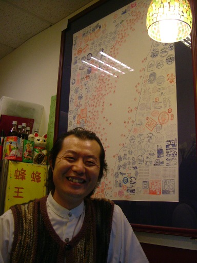 「Blue哥哥」站在全台唯一的戳章地圖前面微笑著說:「全台灣就這一張喲!」