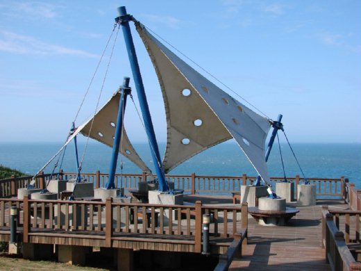 沿著木板步道往前走,在臨海的「大風車」底下,是一個觀景平台,造型非常漂亮,馬 亞也很喜歡,它看起來像是「風帆」,白色的船帆斜張著,寶藍色的桅桿撐起有力的線條,真漂亮喲!