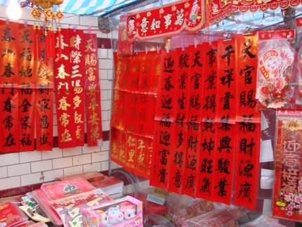 有賣春聯的、有賣春花的。今年是「豬」年,諸事大吉,所以豬仔的圖像特別多。