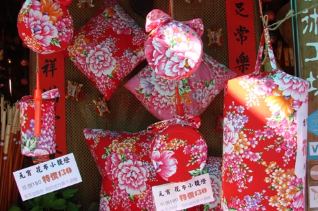 老街商圈人潮擁擠,過年的氣氛還在,店家擺出應景的各式燈籠,尤其是用大紅牡丹花布做成的「布燈籠」,造型樸拙,花色俗麗,最有看頭。點亮花布燈籠後就會散發出一種「台灣味」的喜氣喲!